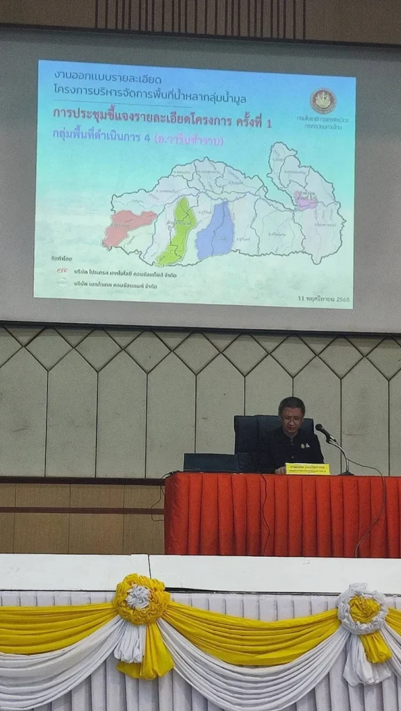 วันที่ 11 พฤศจิกายน 2568 เวลา 13.00 น. นายกานต์ กัลป์ตินันท์ นายกองค์การบริหารส่วนจังหวัดอุบลราชธานี มอบหมายให้ นายอุทัย วะรงค์ พนักงานผู้สูงอายุทรงคุณวุฒิเฉพาะทาง พร้อมด้วยเจ้าหน้าที่ที่เกี่ยวข้อง ร่วมประชุมชี้แจงรายละเอียดโครงการ ครั้งที่ 1 งานออกแบบรายละเอียดโครงการบริหารจัดการพื้นน้ำหลากลุ่มน้ำมูล การประชุมมีวัตถุประสงค์หลักเพื่อสรุปข้อมูลพื้นฐาน และนำเสนอองค์ประกอบของงานออกแบบรายละเอียด พร้อมทั้งเปิดเวทีรับฟังความคิดเห็นและข้อเสนอแนะจากภาคส่วนต่าง ๆ
