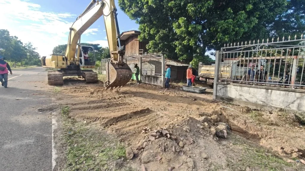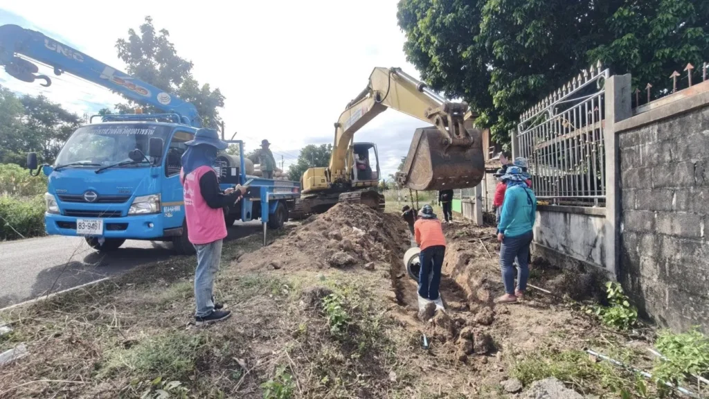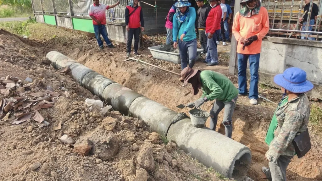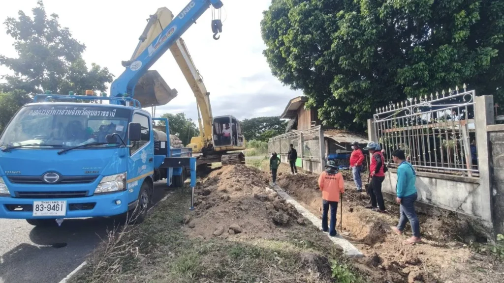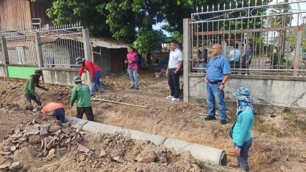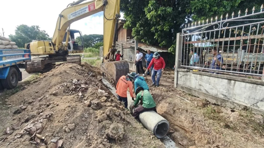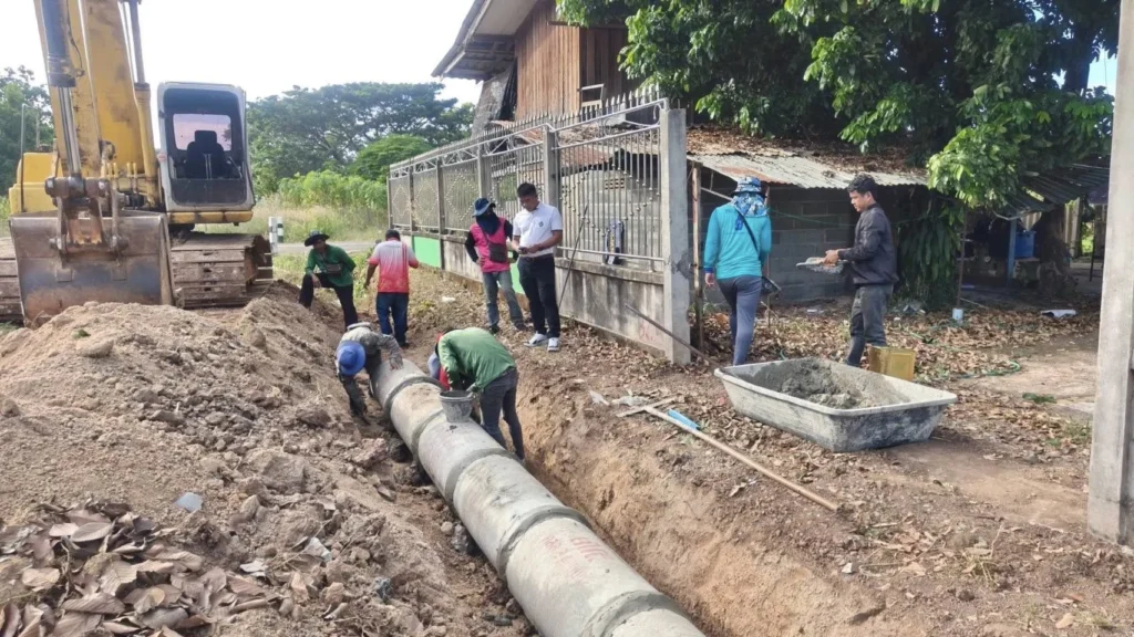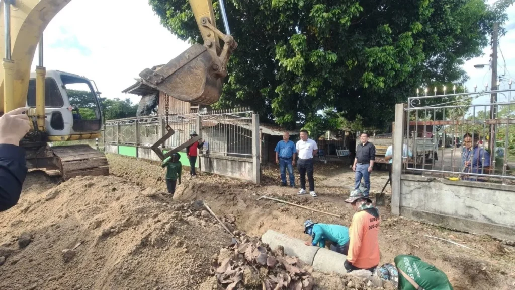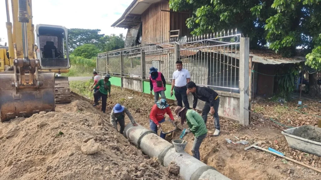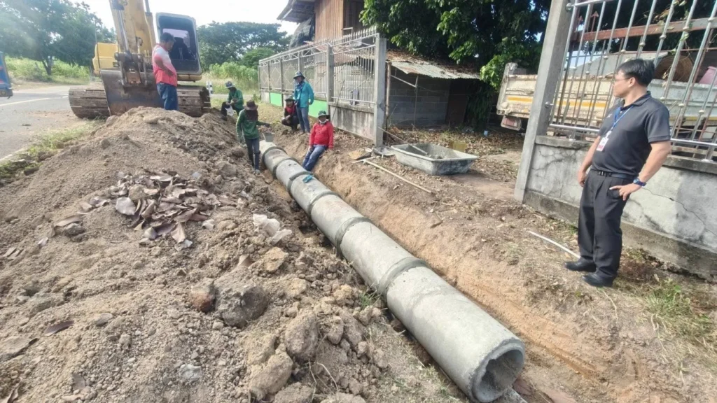 อบจ.อุบลราชธานี วางท่อระบายน้ำบริเวณด้านหน้าโรงเรียนน้ำขุ่นวิทยา