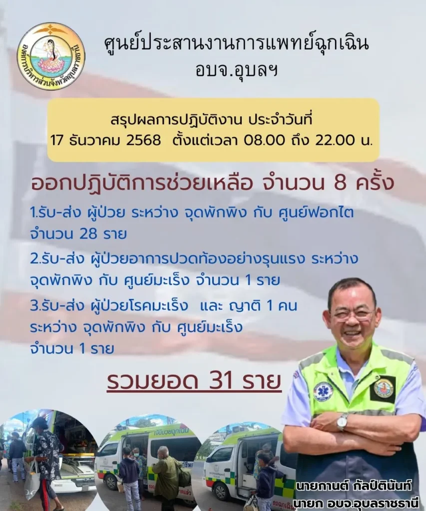 สรุปเหตุการณ์ ประจำวันศูนย์ประสานงานการแพทย์ฉุกเฉิน ในสถานการณ์ความไม่ปลอดภัยในชายแดนไทย-กัมพูชา ภายใต้การบริหารโดยองค์การบริหารส่วนจังหวัดอุบลราชธานี 17 ธันวาคม 202519 ธันวาคม 2025 Thanita Pakkad กองสาธาฯ, ข่าว อบจ.อุบลฯ, ข่าวสำนักปลัด สรุปเหตุการณ์ ประจำวันศูนย์ประสานงานการแพทย์ฉุกเฉิน ในสถานการณ์ความไม่ปลอดภัยในชายแดนไทย-กัมพูชา ภายใต้การบริหารโดยองค์การบริหารส่วนจังหวัดอุบลราชธานีประจำ วันที่ 17 ธันวาคม 2568 ตั้งแต่เวลา 08.00 -20.00 น. FacebookFacebookLINELine Thanita Pakkad