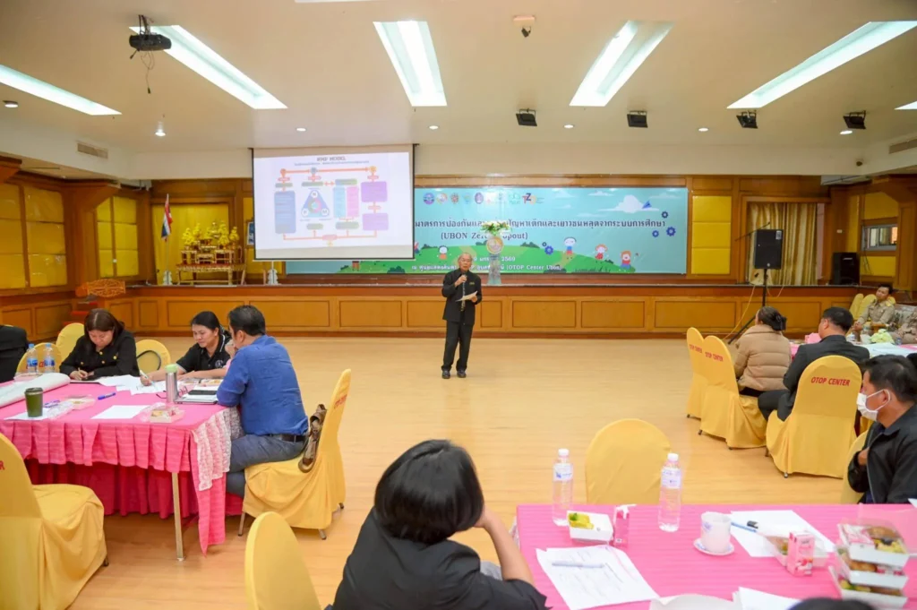 การประชุมจัดขึ้น ณ ศูนย์แสดงและจำหน่ายสินค้าหนึ่งตำบลหนึ่งผลิตภัณณ์ (OTOP Center) จังหวัดอุบลราชธานี โดยมีผู้บริหาร ผู้แทนหน่วยงานด้านการศึกษา ภาคีเครือข่าย และผู้เกี่ยวข้องเข้าร่วม เพื่อร่วมแลกเปลี่ยนแนวทางเชิงนโยบายและเชิงปฏิบัติในการป้องกันและแก้ไขปัญหาเด็กและเยาวชนหลุดจากระบบการศึกษาอย่างเป็นรูปธรรม