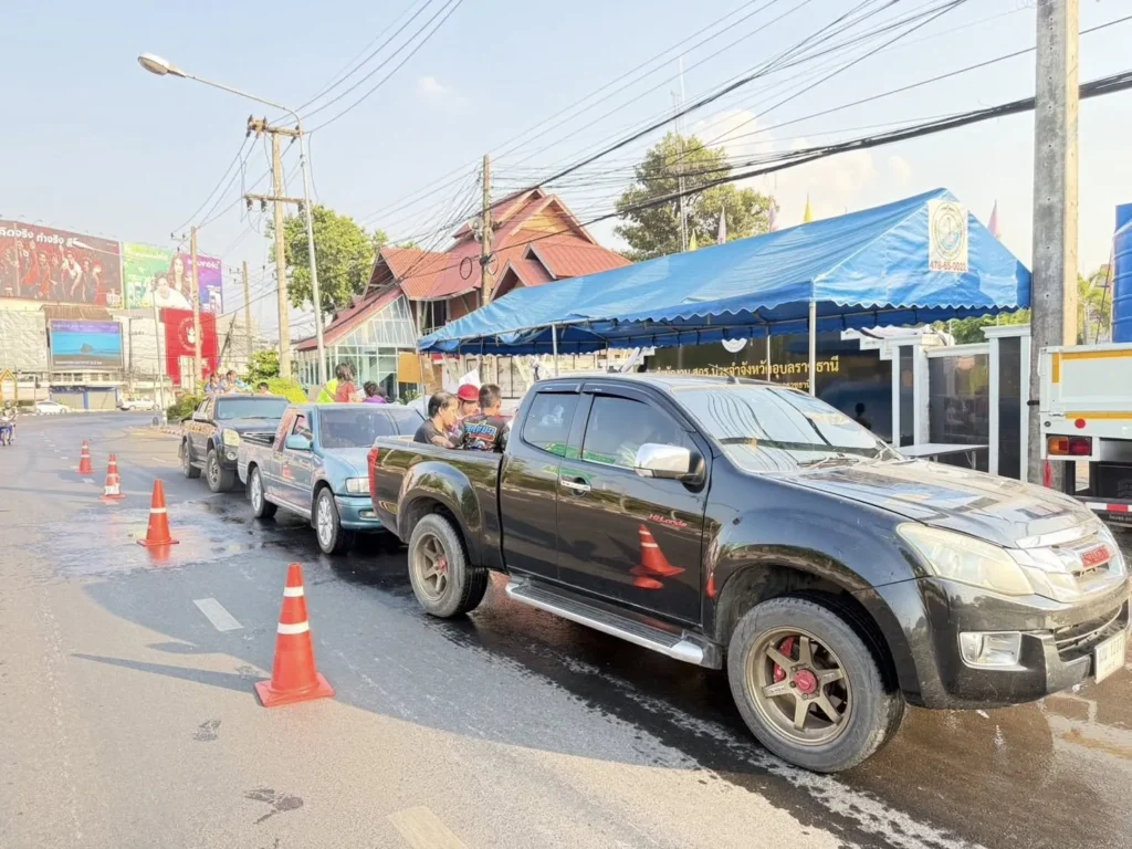 วันที่ 14 เมษายน 2569 เวลา 15.00 น. เจ้าหน้าที่ฝ่ายป้องกันและบรรเทาสาธารณภัย อบจ.อุบลราชธานี นำรถบรรทุกน้ำ จำนวน 1 คัน ลงพื้นที่ปฏิบัติหน้าที่ให้บริการน้ำแก่พี่น้องประชาชนที่ใช้รถสัญจรและร่วมเล่นน้ำบนท้องถนนในช่วงเทศกาลสงกรานต์