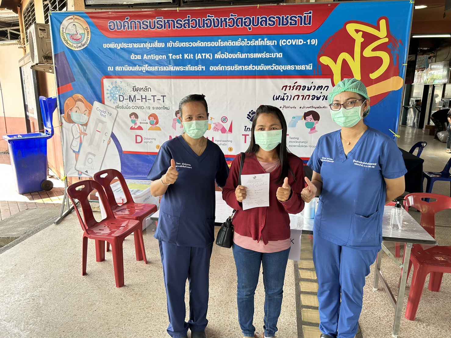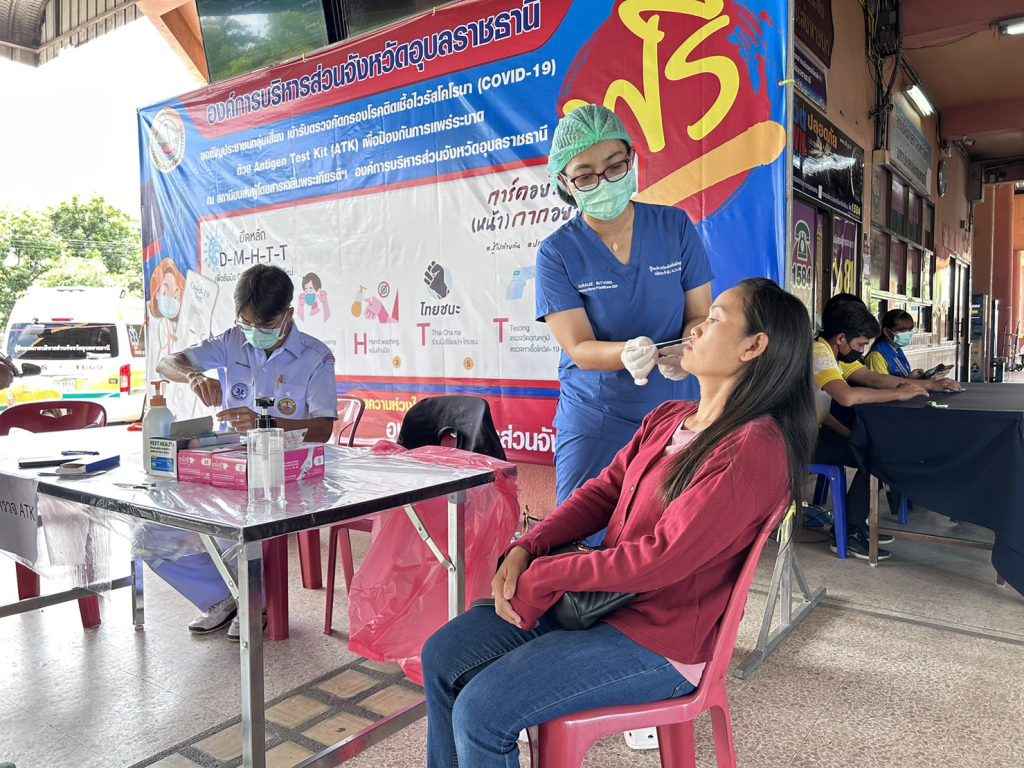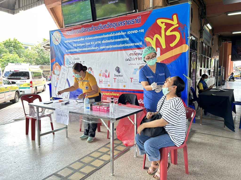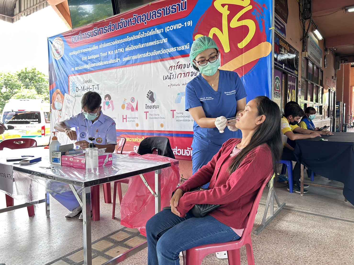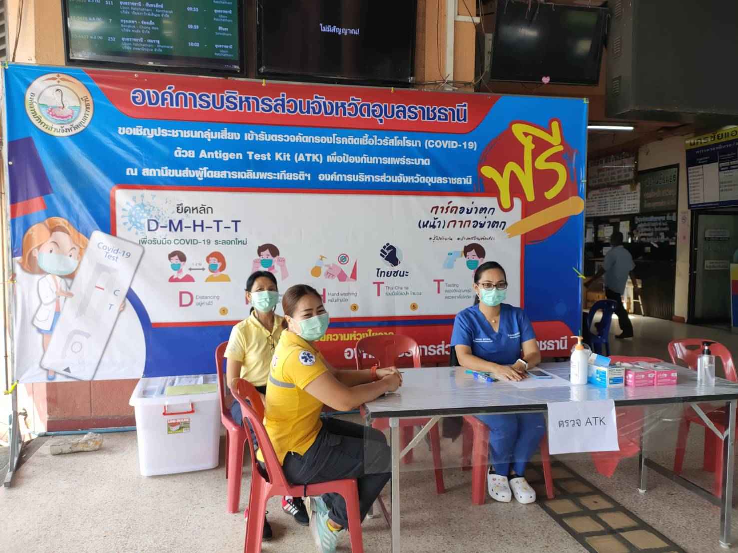 ตั้งจุดให้บริการตรวจ ATK COVID-19 ฟรี แก่ประชาชนกลุ่มเสี่ยงที่เดินทางมาใช้บริการที่สถานีขนส่งผู้โดยสารเฉลิมพระเกียรติ อบจ.อุบลราชธานี