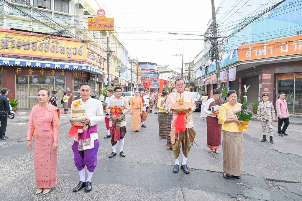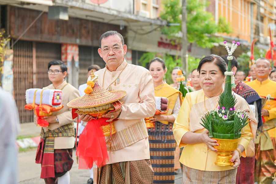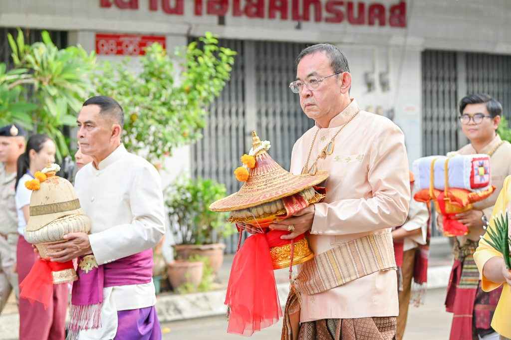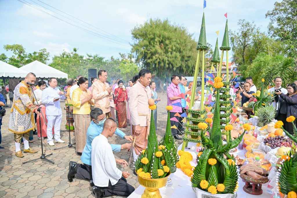 วรราชสุริยวงษ์ (เจ้าคำผง) ผู้ก่อตั้งเมืองอุบลราชธานี โดยประธานในพิธี ประกอบพิธีไหว้พระเจ้าใหญ่องค์หลวง และอัญเชิญดวงวิญญาณเจ้าคำผง และเคลื่อนขบวนอัญเชิญเครื่องยศเจ้าเมืองตามแบบโบราณจากวัดหลวง มายังอนุสาวรีย์พระประทุมวรราชสุริยวงษ์ (เจ้าคำผง) ทุ่งศรีเมือง ถวายภัตราหารแด่พระสงฆ์ ณ ศาลาจัตุรมุขทุ่งศรีเมือง จากนั้นตัวแทนหน่วยงานองค์กร ภาครัฐ เอกชนร่วมวางขันหมากเบ็งประธานในพิธีจุดธูปเทียนประกอบพิธีบวงสรวง เปลี่ยนผ้าแพร