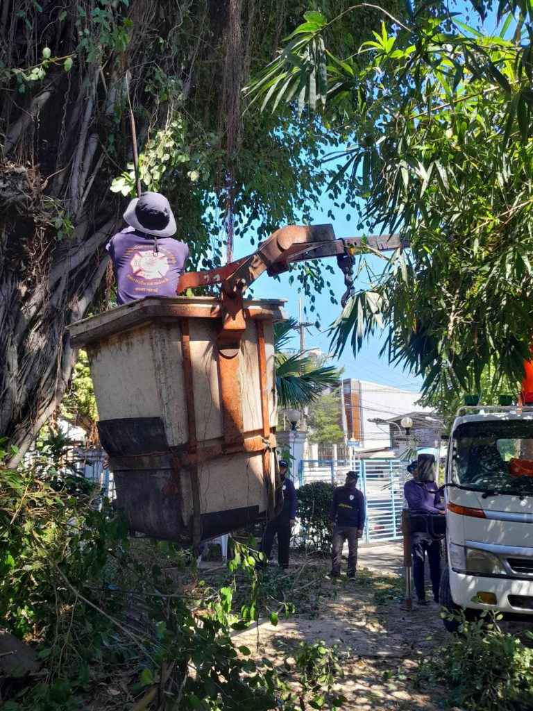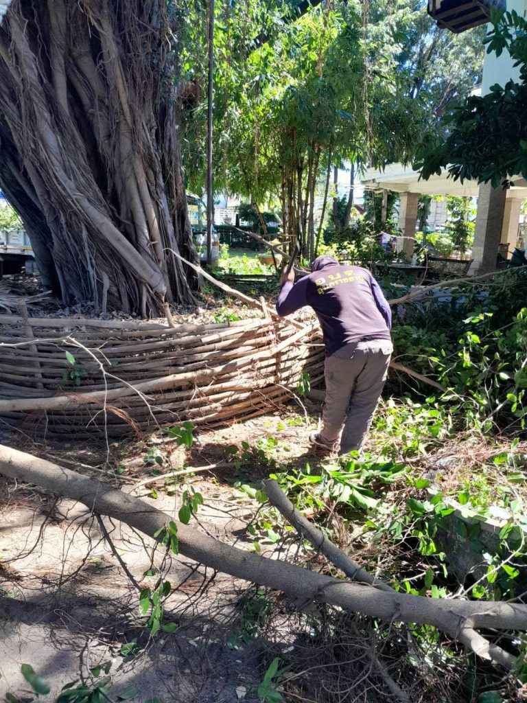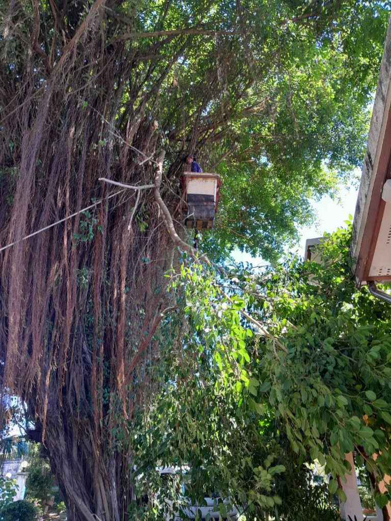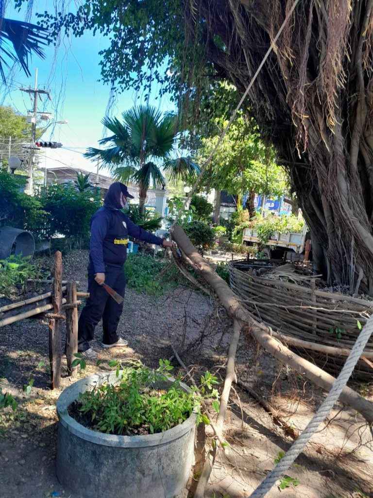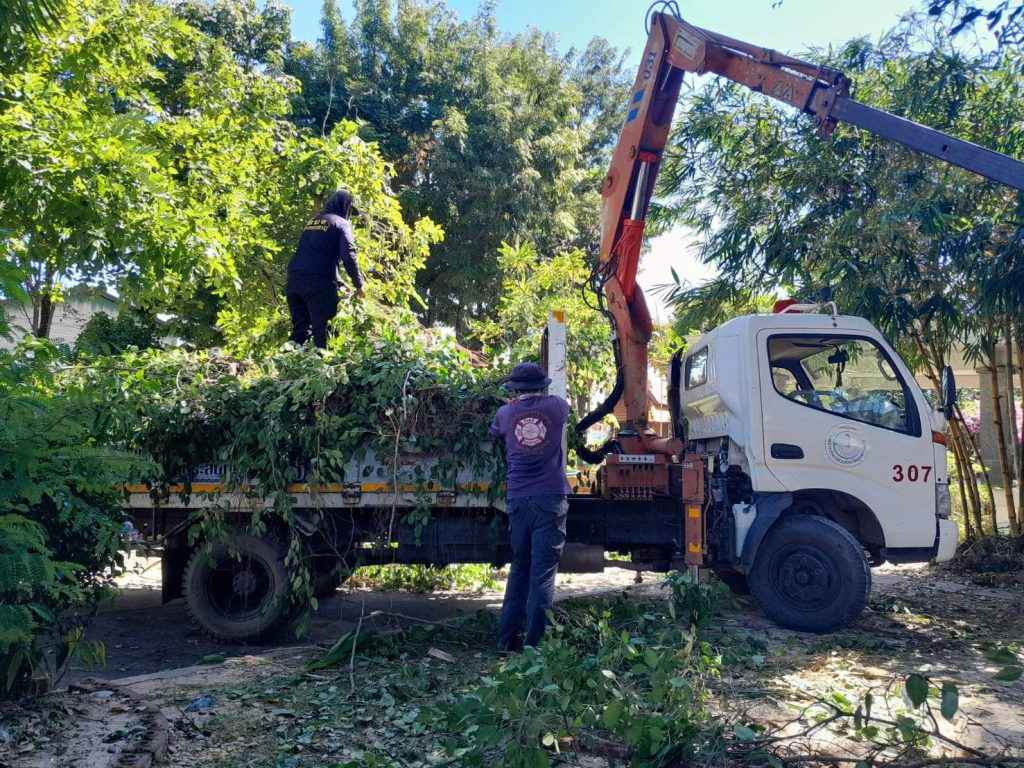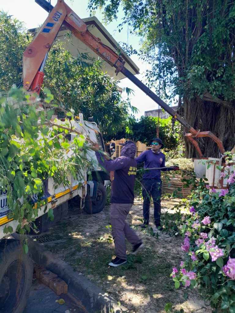 และเจ้าหน้าที่ ที่เกี่ยวข้องฯ นำเครื่องจักรกล/วัสดุ/อุปกรณ์เข้าร่วมดำเนินการตัดแต่งกิ่งต้นไม้บริเวณจวน