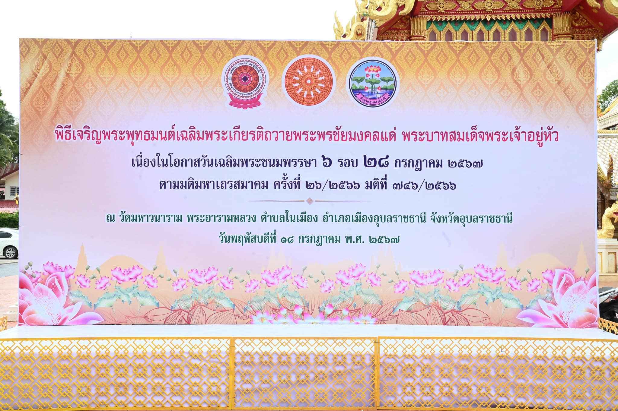 โดยมี นายศุภศิษย์ กอเจริญยศ ผู้ว่าราชการจังหวัดอุบลราชธานี เป็นประธานในพิธี ณ วัดมหาวนาราม พระอารามหลวง อ.เมืองฯ จ.อุบลราชธานี โดยจังหวัดอุบลราชธานี ได้กำหนดจัดให้มีพิธีเจริญพระพุทธมนต์ ถวายพระพรชัยมงคลแด่พระบาทสมเด็จพระเจ้าอยู่หัว มหาวชิราลงกรณ บดินทรเทพยวรางกูร เนื่องในโอกาสวันเฉลิมพระชนมพรรษา 6 รอบ 28 กรกฎาคม 2567 ตั้งแต่เดือนกุมภาพันธ์ ไปจนถึงเดือนธันวาคม 2567 เพื่อแสดงออกถึงความจงรักภักดีและสำนึกในพระมหากรุณาธิคุณอย่างหาที่สุดมิได้