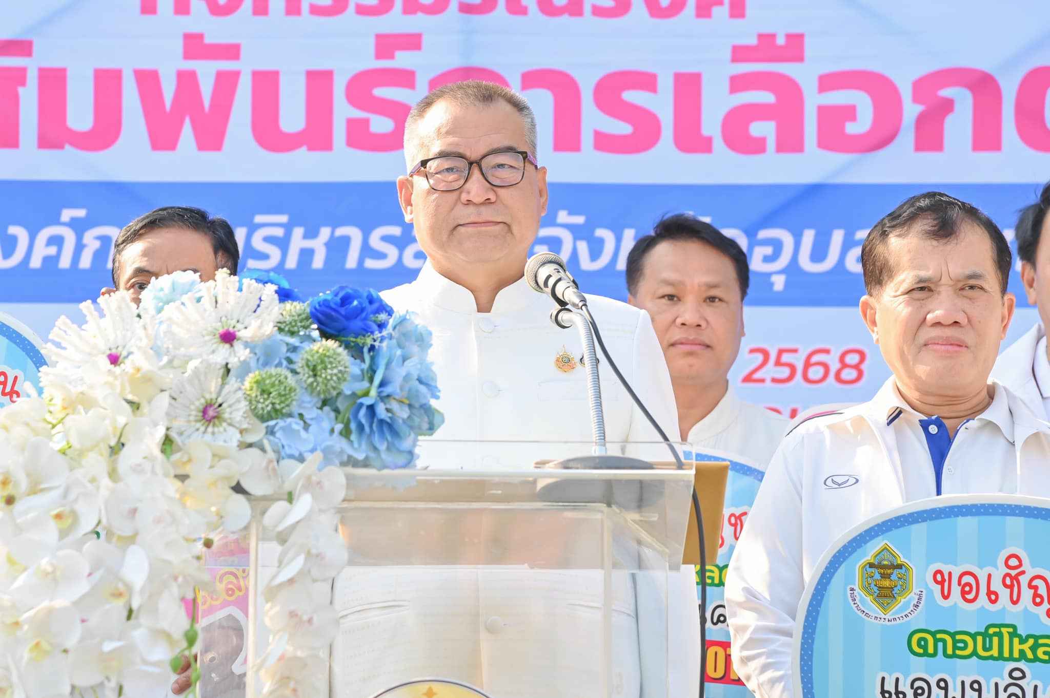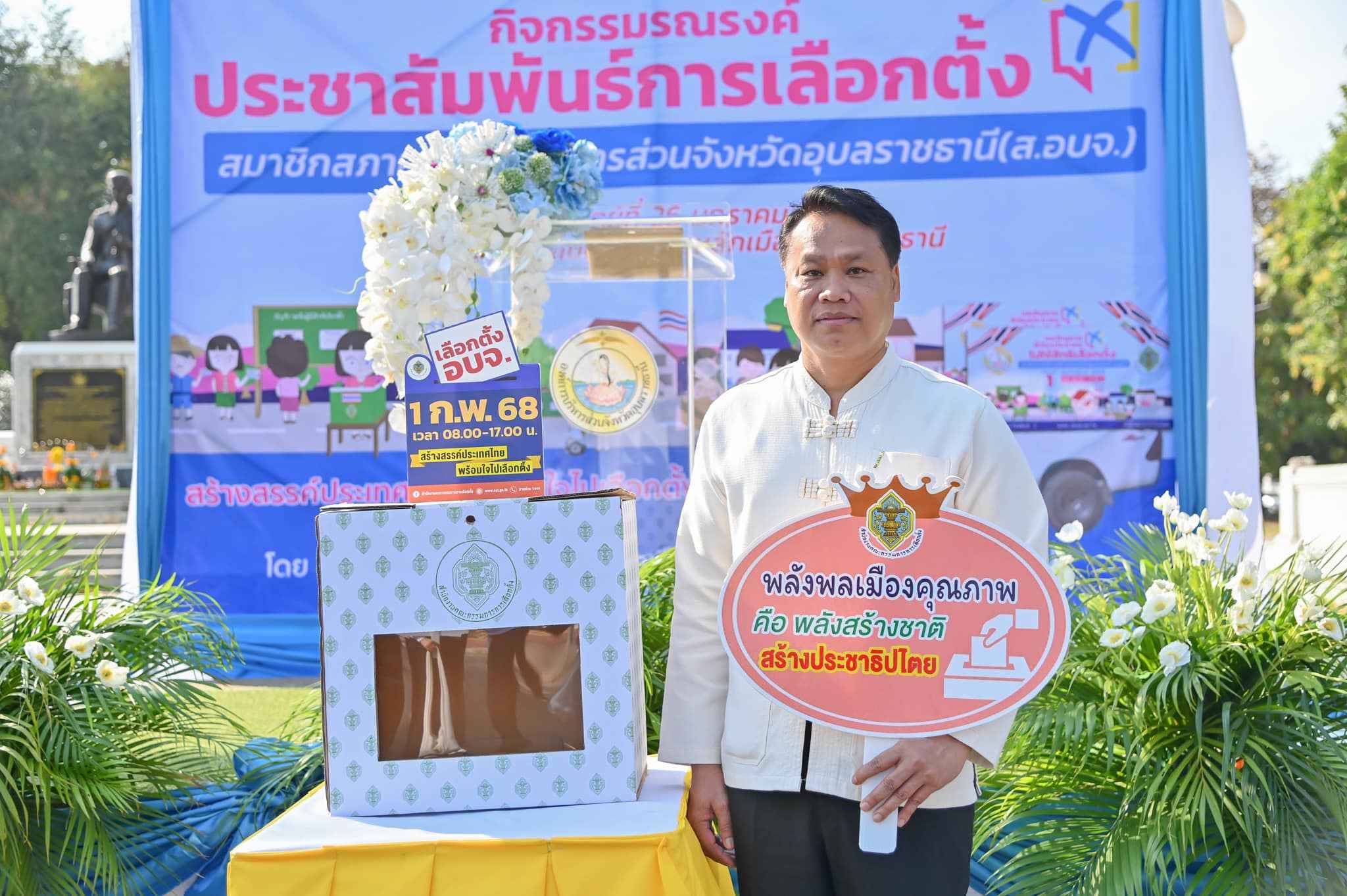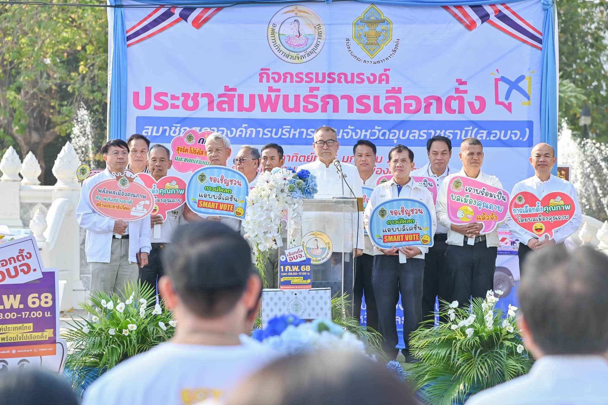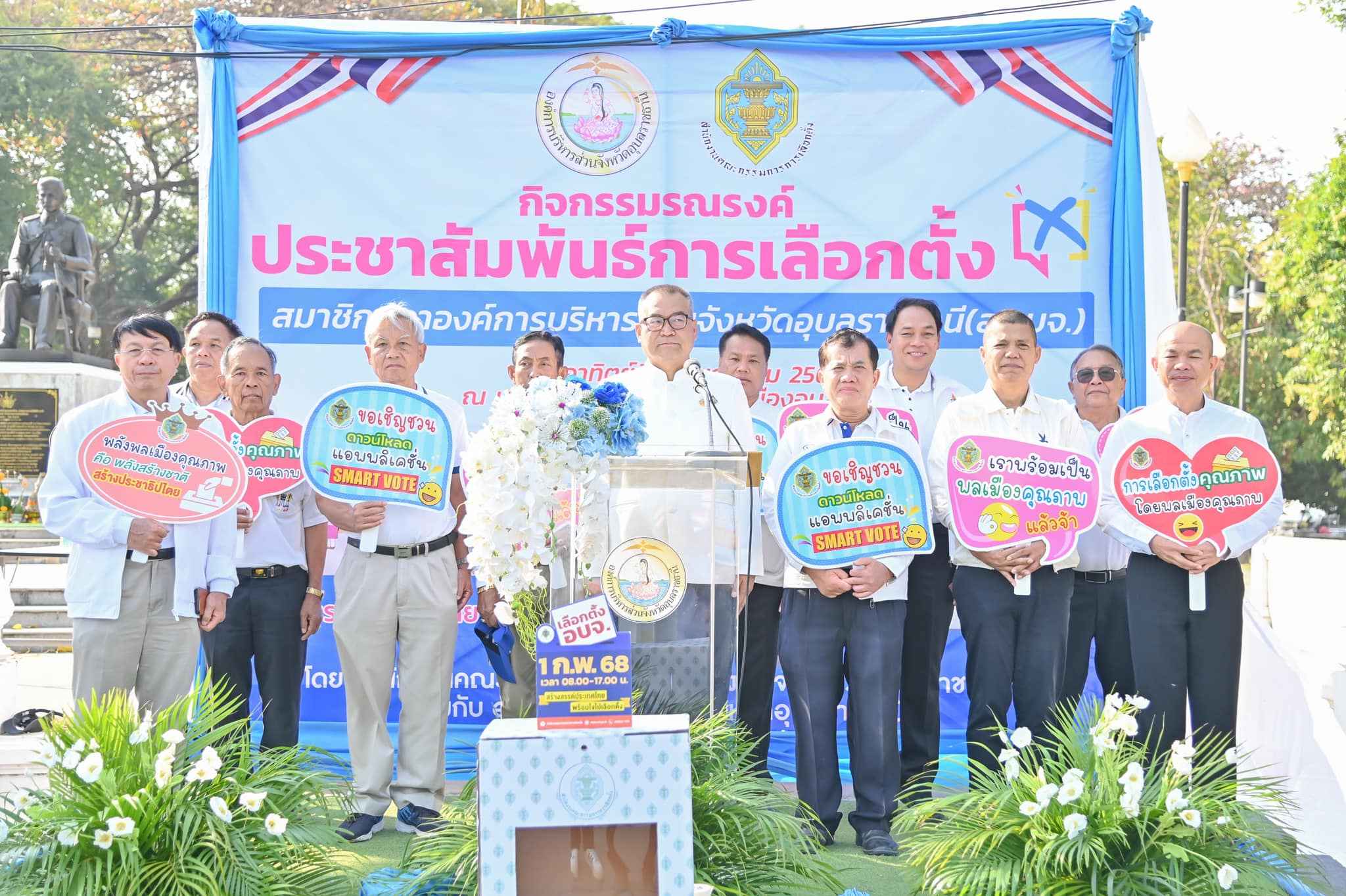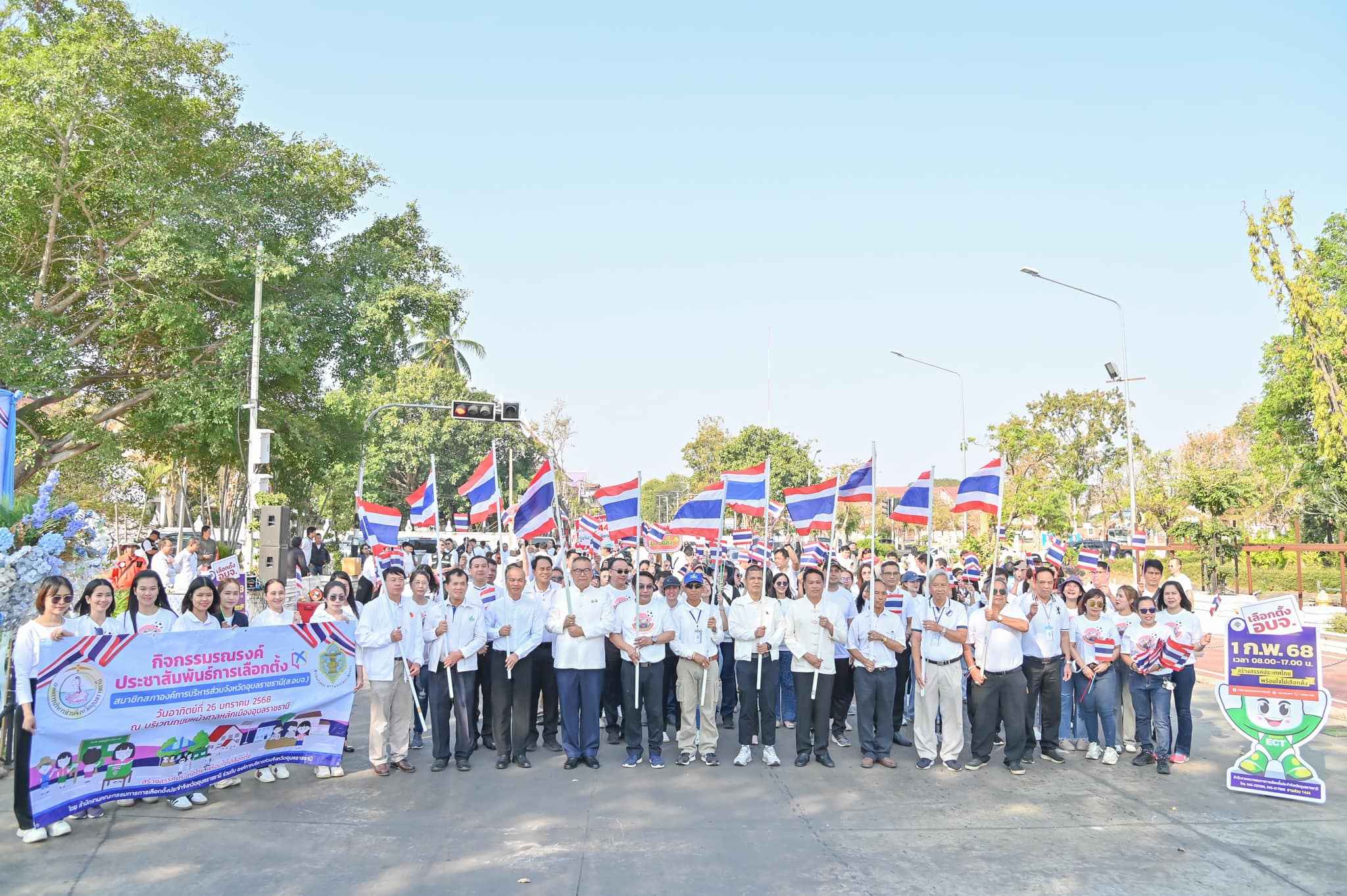 วันที่ 26 มกราคม 2568 เวลา 09.00 น. ว่าที่พันตรีอดิศักดิ์ น้อยสุวรรณ ผู้ว่าราชการจังหวัดอุบลราชธานี เป็นประธานในพิธีเปิดกิจกรรมประชาสัมพันธ์เชิญชวนไปใช้สิทธิเลือกตั้งสมาชิกสภาองค์การบริหารส่วนจังหวัด ตามโครงการพัฒนานวัตกรรมช่องทางการเข้ามามีส่วนร่วมทางการเมือง โดยนายอภิศักดิ์ ทองกลึง ผู้อำนวยการการเลือกตั้งประจำองค์การบริหารส่วนจังหวัดอุบลราชธานี นำหัวหน้าส่วนราชการ ข้าราชการ และพนักงานในสังกัดเข้าร่วมกิจกรรม ณ บริเวณศาลหลักเมืองอุบลราชธานี