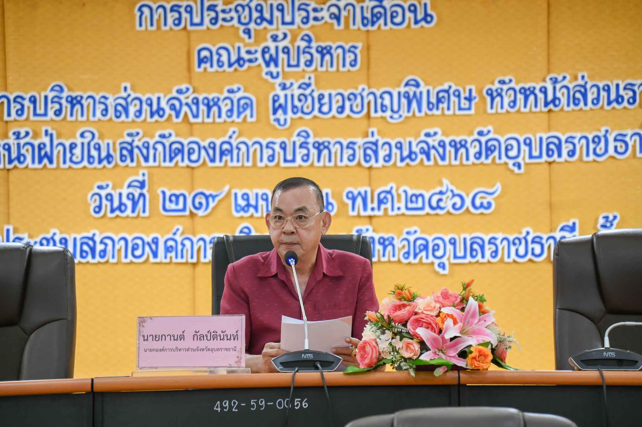 วันที่ 29 เมษายน 2568 เวลา 09.30 น. นายกานต์ กัลป์ตินันท์ นายกองค์การบริหารส่วนจังหวัดอุบลราชธานี เป็นประธานการประชุม ประชุมคณะผู้บริหาร ปลัดองค์การบริหารส่วนจังหวัด ผู้เชี่ยวชาญพิเศษ หัวหน้าส่วนราชการ และหัวหน้าฝ่ายในสังกัดฯประจำเดือนเมษายน 2568 ครั้งที่ 4/2568 ณ ห้องประชุมสภาองค์การบริหารส่วนจังหวัดอุบลราชธานี ชั้น 3